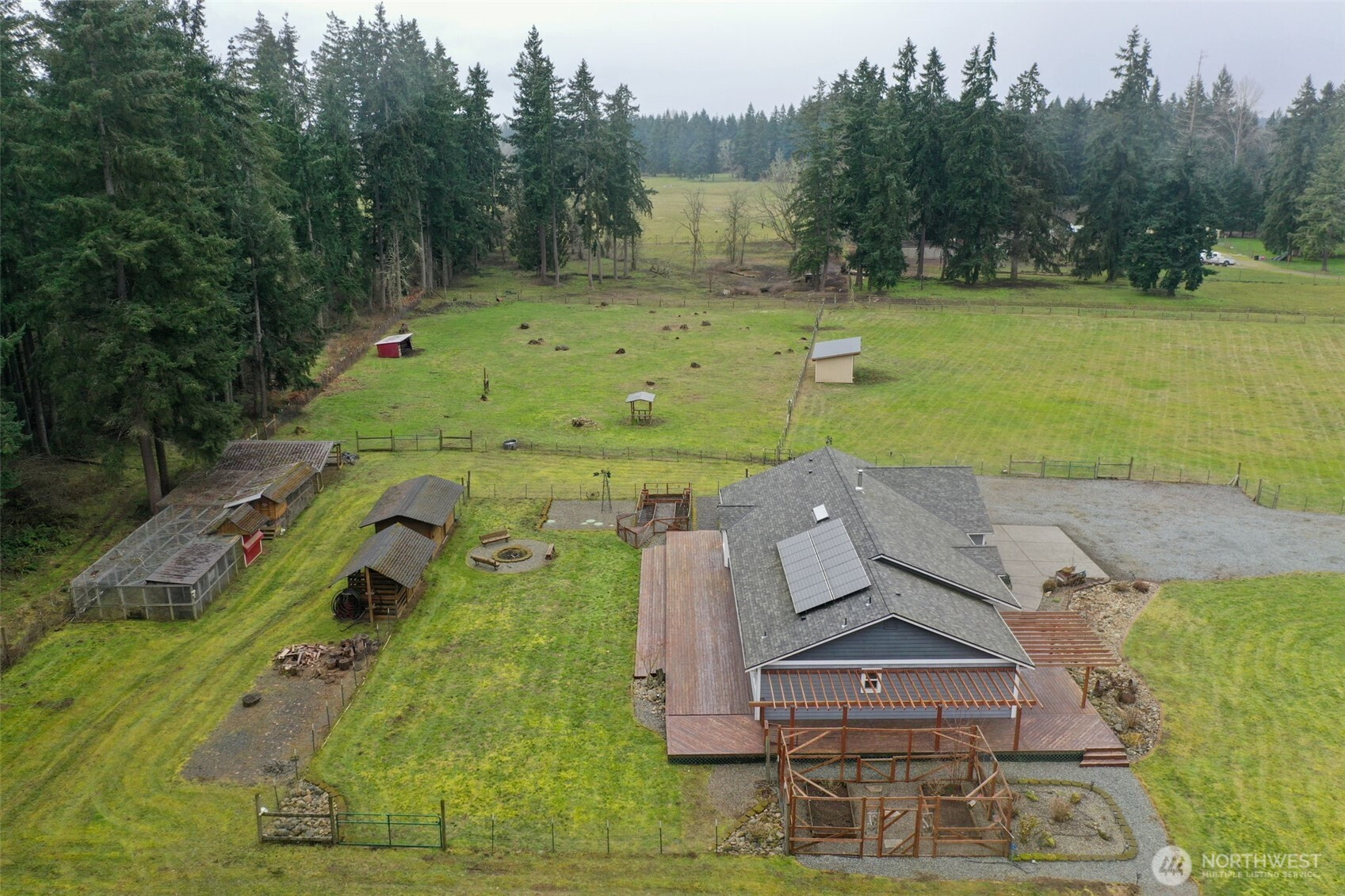 (650)533-3259Equestrian and livestock ready on 5 gated, fully fenced and cross fenced acres at the end of Witland Ln. This thoughtfully maintained 3 bedroom, 2 bath rambler with office and 3 car garage offers a well designed single level floor plan and fresh interior paint throughout. Designed for both comfort and functionality, the property features multiple run in shelters, a large chicken coop, wood shed with firewood, storage shed, two garden areas with drip irrigation, established berry bushes and fruit trees. The 40 x 60 fully insulated shop is a standout feature with its own gated driveway, 200 amp service and dual 14 x 16 self locking doors, ideal for equipment, hobbies or workspace needs. Solar panels help offset power costs, while a wood stove provides supplemental heat during cooler months. Private well. No HOA, with only an annual road maintenance agreement. Enjoy a peaceful rural setting just minutes to Yelm, with convenient access to JBLM and alternate routes to I 5. A rare combination of privacy, functionality and location.