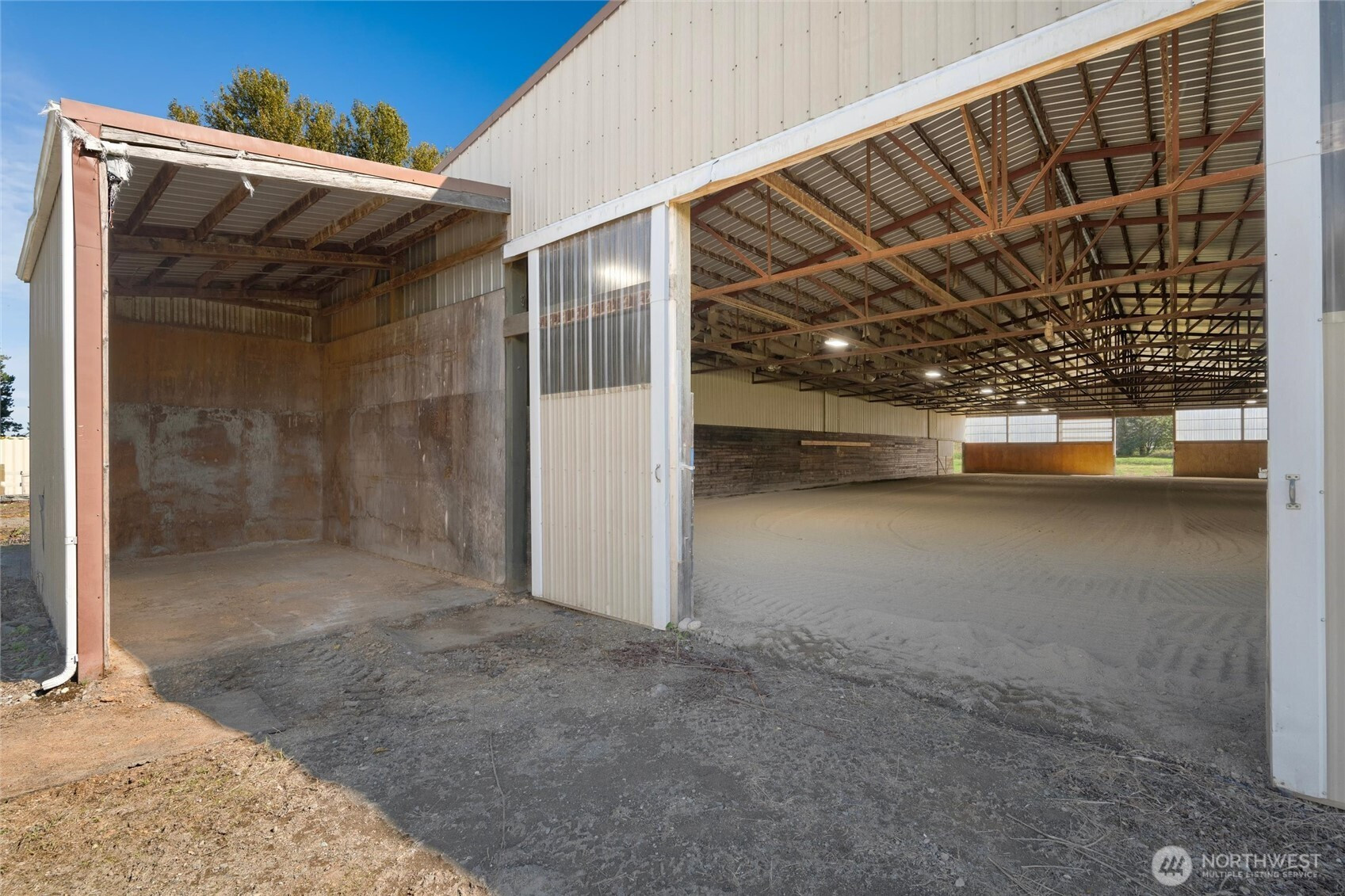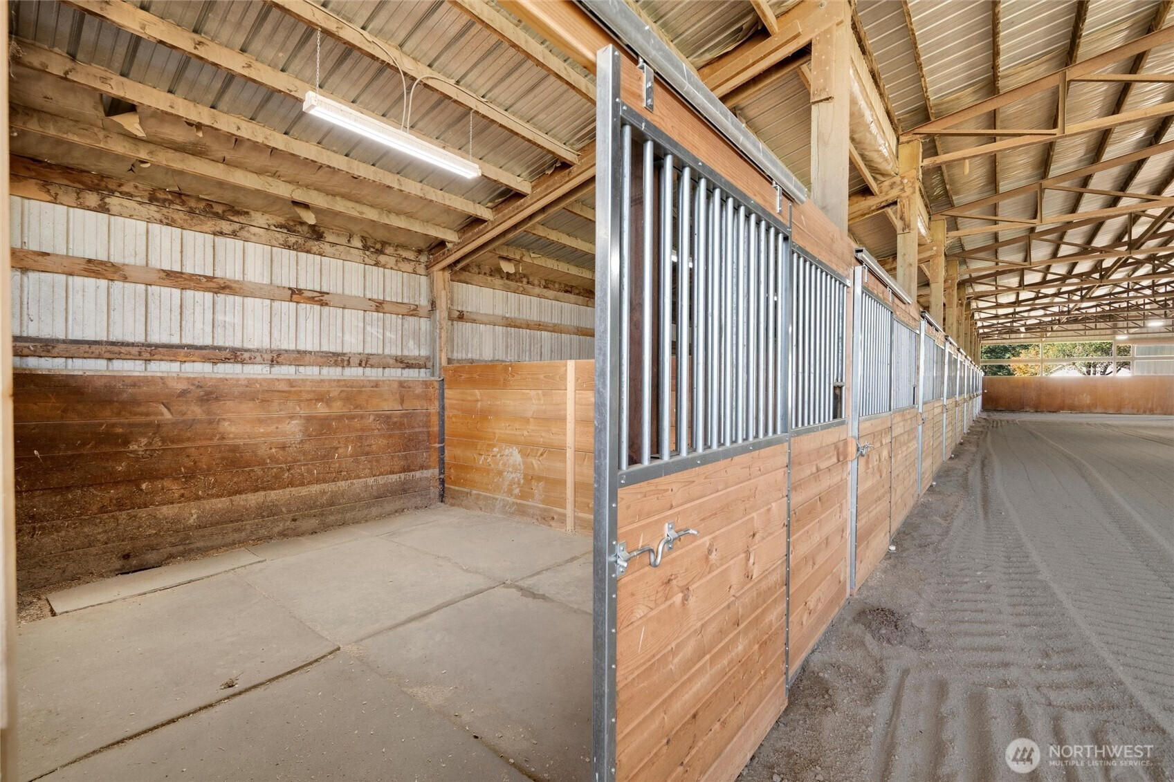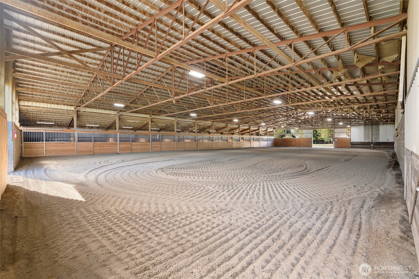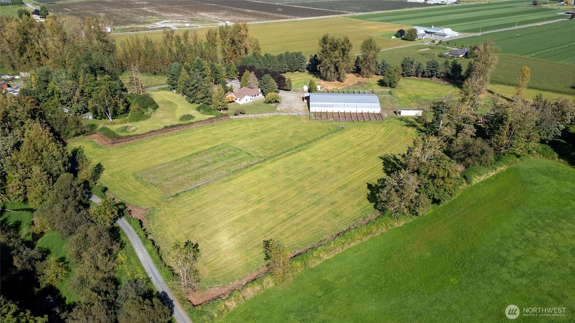 (650)533-3259*No water intrusion into the house from recent flooding* Welcome to Eagle Creek Farms. This stunning gated 13.9-acre equestrian property is conveniently located just minutes from the U.S./Canada border. Designed with equestrian enthusiasts in mind, the property includes an impressive 120’ x 90’ indoor riding arena with 21 stalls (12 stalls with runs), a heated tack room, hay storage, covered shaving bin, and a heated indoor wash rack. A 4-stall loafing shed complements the fully fenced and cross-fenced acreage, complete with multiple pastures making this a turnkey training or boarding facility. This beautiful estate features a single-level, 3-bedroom, 2-bathroom rambler with a spacious 3-car garage. The private primary suite includes an updated en-suite bathroom and direct access to the patio, offering serene views of the barn and surrounding property. The updated kitchen boasts quartz countertops and stainless-steel appliances, seamlessly opening to the inviting living room, complete with a cozy wood-burning fireplace. Designed for both comfort and functionality, this home provides a peaceful retreat in a tranquil rural setting.