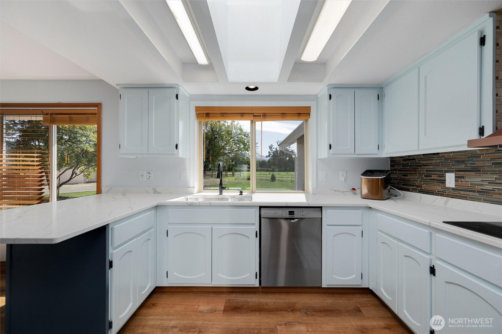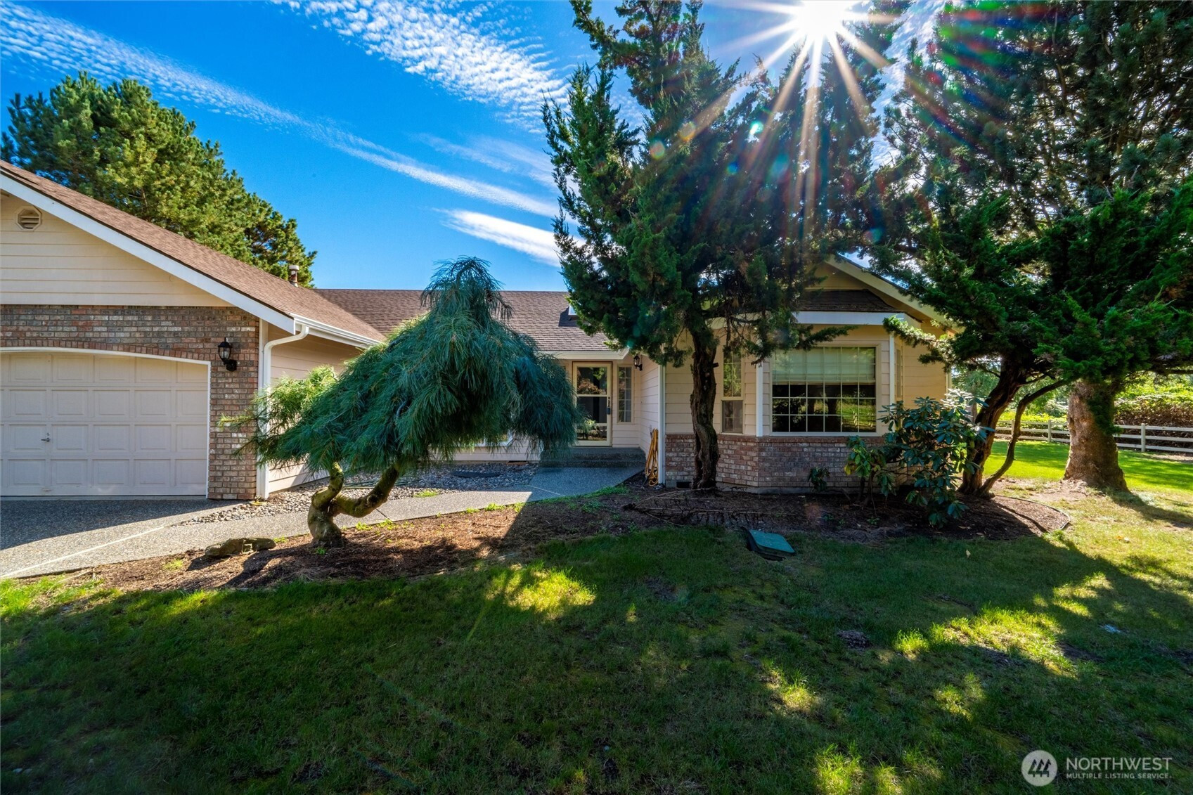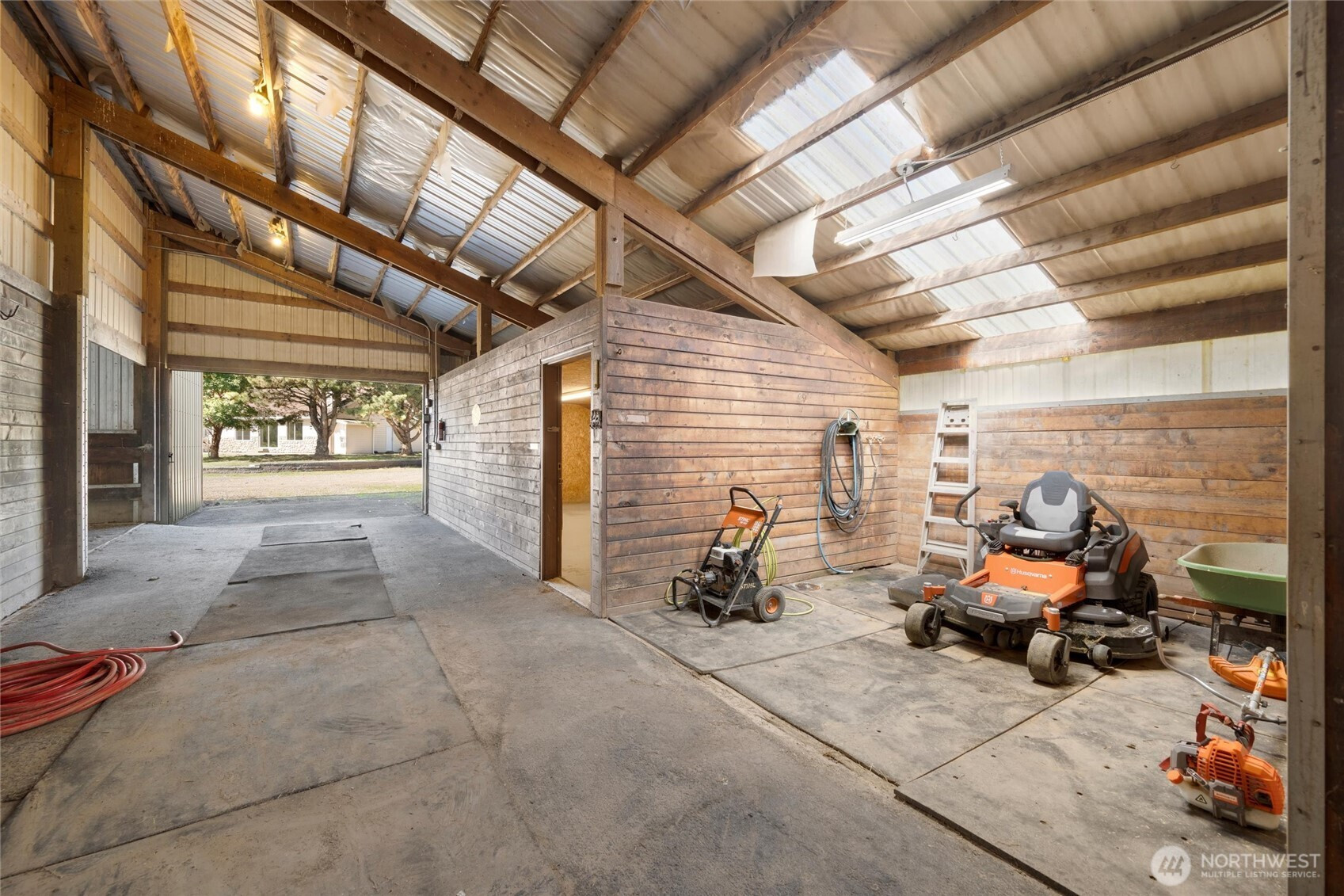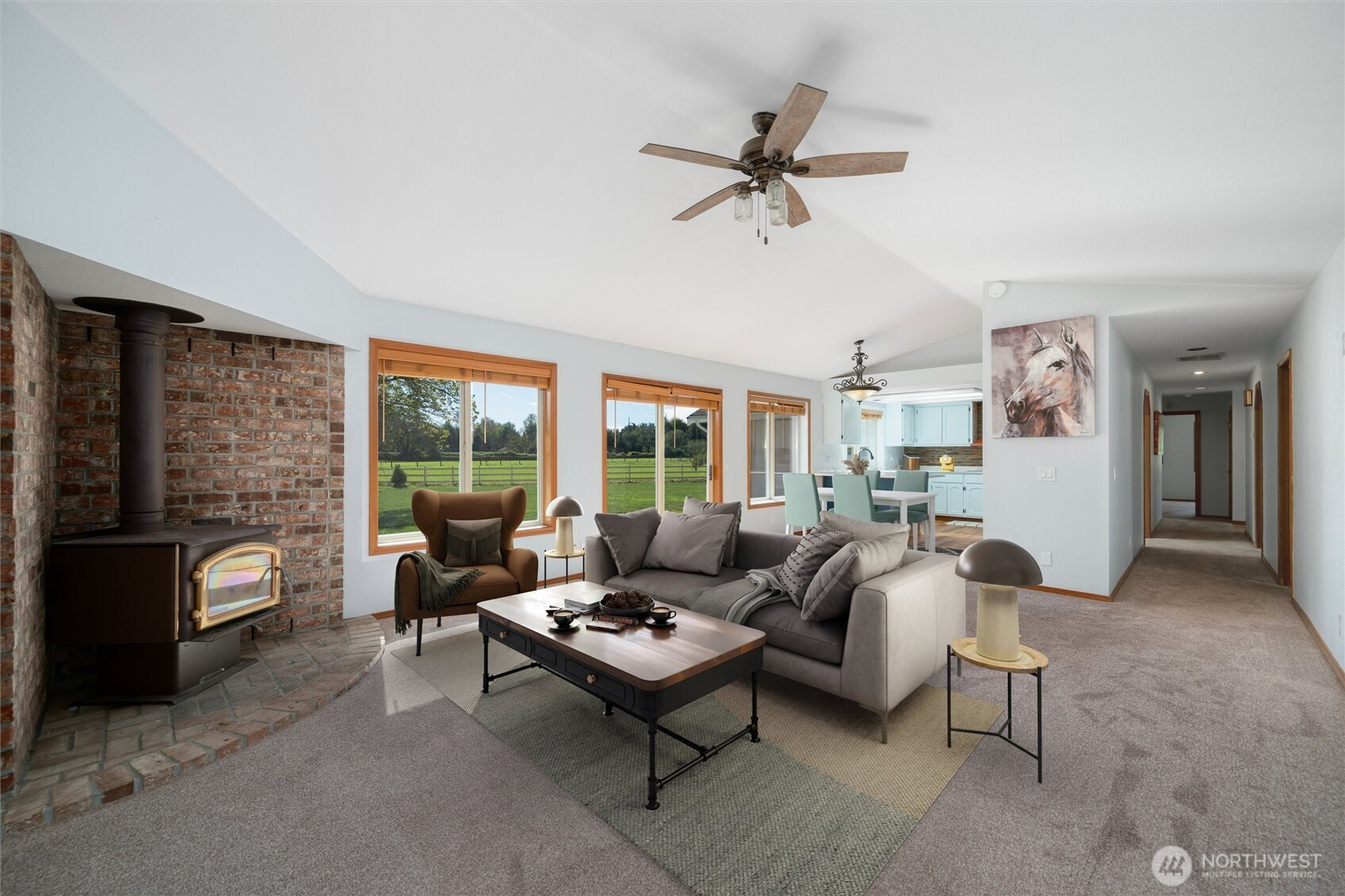 (650)533-3259*No water intrusion into the house from recent flooding* Welcome to Eagle Creek Farms. This stunning gated 13.9-acre equestrian property is conveniently located just minutes from the U.S./Canada border. Designed with equestrian enthusiasts in mind, the property includes an impressive 120’ x 90’ indoor riding arena with 21 stalls (12 stalls with runs), a heated tack room, hay storage, covered shaving bin, and a heated indoor wash rack. A 4-stall loafing shed complements the fully fenced and cross-fenced acreage, complete with multiple pastures making this a turnkey training or boarding facility. This beautiful estate features a single-level, 3-bedroom, 2-bathroom rambler with a spacious 3-car garage. The private primary suite includes an updated en-suite bathroom and direct access to the patio, offering serene views of the barn and surrounding property. The updated kitchen boasts quartz countertops and stainless-steel appliances, seamlessly opening to the inviting living room, complete with a cozy wood-burning fireplace. Designed for both comfort and functionality, this home provides a peaceful retreat in a tranquil rural setting.